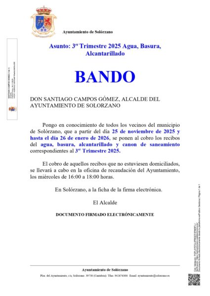 El Ayuntamiento de Solórzano informa a todos los vecinos que desde el 25 de noviembre de 2025 y hasta el 26 de enero de 2026 estará abierto el periodo de cobro de los recibos correspondientes al 3º Trimestre de 2025.